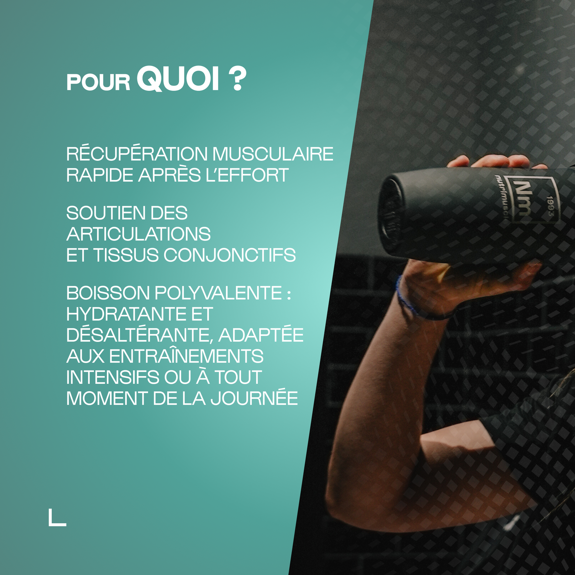 Soutien la récupération globale après l'effort pour réduire la fatigue, les courbatures et assurer l'intensité et l'efficacité de chaque entrainement